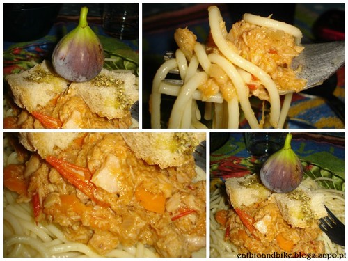 Coloquei ainda um pouquinho de pão, com um bocadinho de azeite e com orégãos. Conjugados com a massa ficou uma delícia.