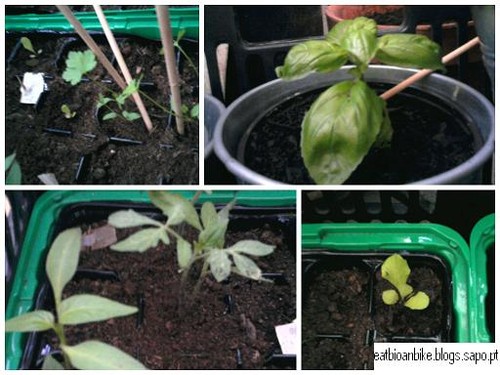 Na foto do lado esquerdo em baixo, apresento no cantinho os pimentos. Estão mesmo grandes e fortes. E mais ao centro, apresento os tomateiros mais bonitos do mundo (sim, atrevo-me)! Daqui a umas semanas já poderei transplantar.