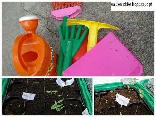 Procurei e encontrei. Os meus antigos brinquedos de praia. Antigos e sujinhos, mas nada que não se remediasse. Lá encontrei uma pá, um apanhador, uma vassoura, um regador (bem giro!), um ancinho e um instrumento bem próprio para fazer uns furinhos na terra. Lavei-os e ao sol brilhavam de felicidade.
